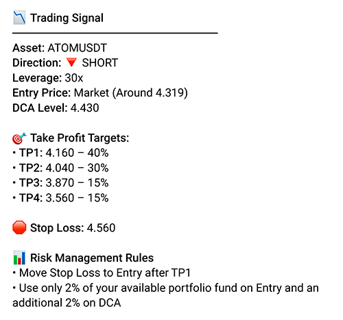 We indicate the Asset (coin), Direction, Leverage, Entry Price, DCA Level, Take Profits with percentage and Stop Loss. Usually, the signal is to use at Market Price, so no need to wait to the price reach some value, but we mention the number (Around X). If you have any doubts about any of this terms or process, you can ask the Admin directly.